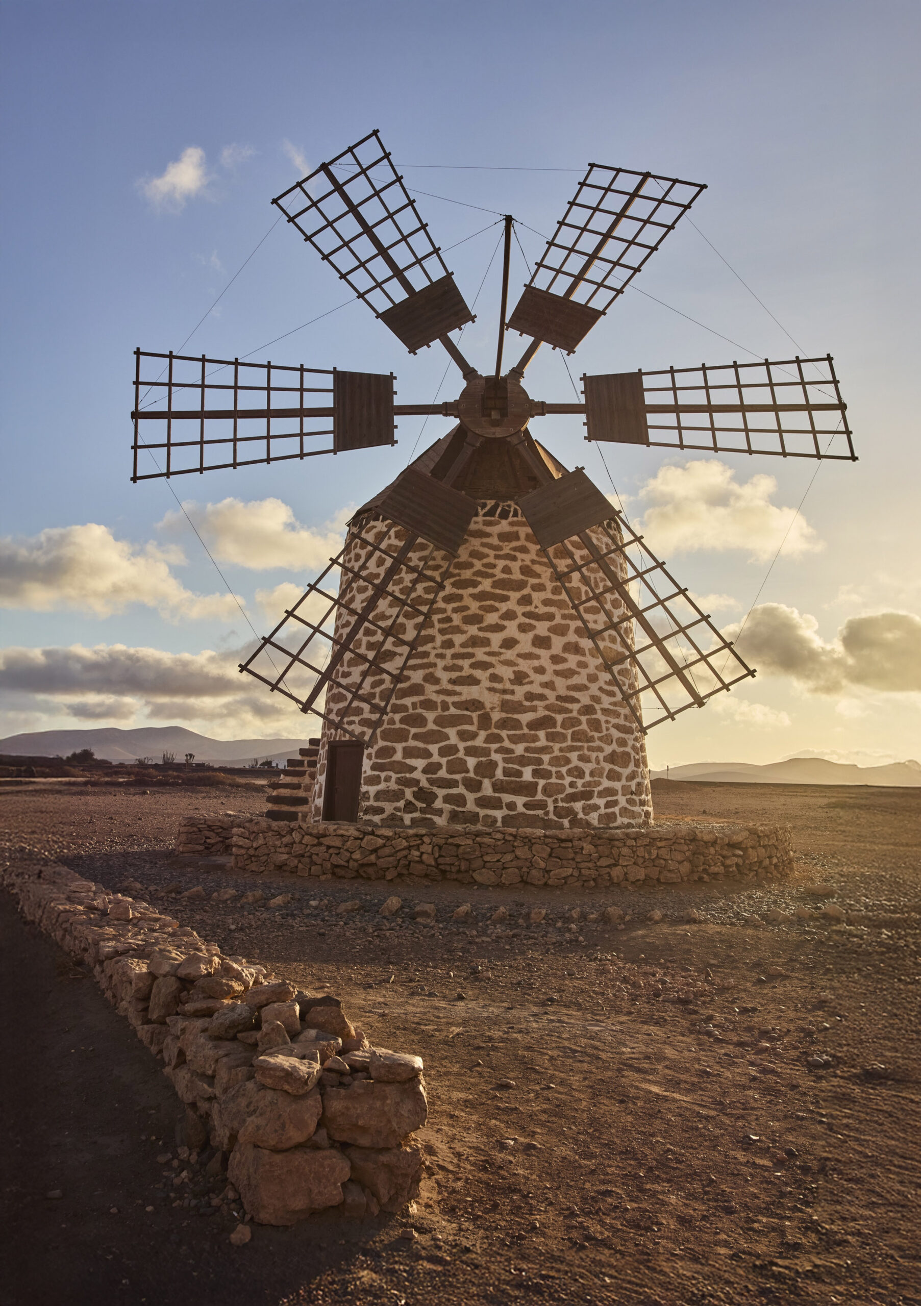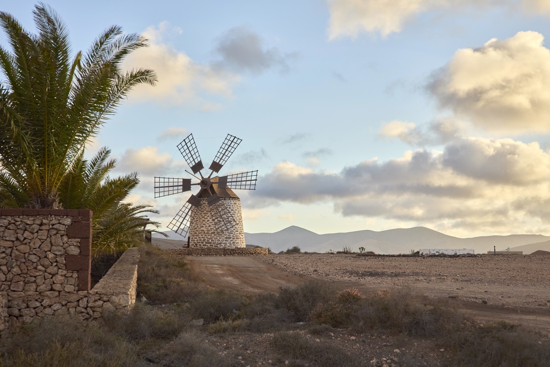 Los molinos de viento son uno de los elementos más característicos del paisaje de Fuerteventura. Los primeros comenzaron a construirse en el siglo XVII, y muchos de ellos están hoy catalogados como Bien de Interés Cultural (BIC), dada su relevancia histórica y etnográfica.